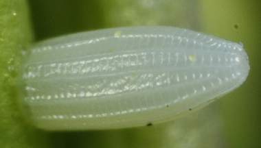 卵(セイヨウカラシナ) 2003年4月19日 大阪府吹田市西御旅町 矢印の位置に卵があります。産卵直後(5分以内)です。 トップページへ |