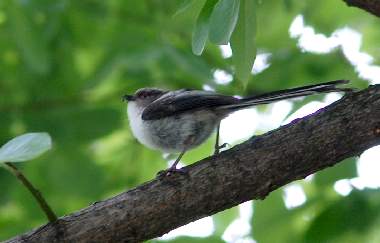 エナガ 2007年5月20日 大阪府豊中市服部緑地公園 群れで渡ってきたのでしょうか、2羽の追いかけ合いなども盛んに見られました。1mぐらいの所まで近づいてとまることもありました。この写真では、何かをくわえています。 トップページへ |