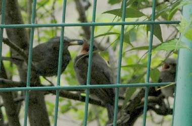 ヒヨドリの子育て 2006年7月1日 大阪市淀川区 我がバタフライガーデンのフェンスの外のセイヨウイボタの茂みで、親子4羽の子育てシーンです。子どもは2羽いて、既に飛べます。ちょうど親鳥の一方がなにかハナムグリでしょうか、餌を持ってきたところです。2羽の子どもが口を大きく開けていますが、もらえるのは一方だけですね。フェンスにピントが合っていてピンぼけです。翌日見ると、庭の食べ頃になったブルーベリーの実がありません。もしかしたら、子に与えているのはそのブルーベリーかもしれません。形状はそっくりです。 トップページへ |