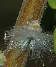 2018年4月29日 静岡市駿河区大谷 一度見たいと思っていたカイガラムシです。白いのは卵嚢で、中に卵がいっぱい入っているそうです。褐色の親に比べて大きな卵嚢がどうやってできるのか不思議です。1匹しかいませんでしたが、いろんな角度から撮ってみました。 トップページへ |
