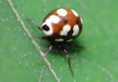 2015年8月18日 静岡市駿河区大谷 たまたま風に吹かれて裏側を見せたササにいました。シロオビと名がついていますが、シロオビのない黒色型のようです。ネットで調べると、もとはクロトリノフンダマシという名の別種とされていたようです。擬態効果としてシロオビとクロで差はあまりないのでしょうか? トップページへ |