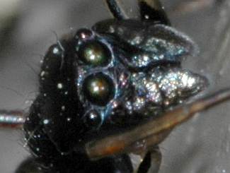 2018年4月21日 静岡市駿河区大谷 マテバシイのひこばえで、ムラサキツバメの幼虫を探していて偶然見つけたハエトリグモです。日本にいる種ではかなり派手な種だそうです。青い帯がきれいでした。体長7mmぐらいで家の中でよく見る種より小さいです。 トップページへ |