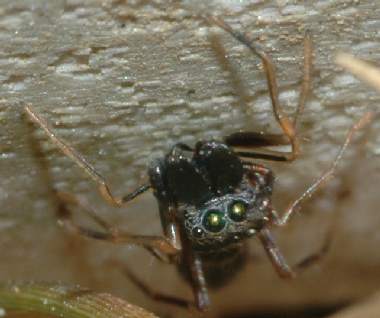 アリグモの仲間(10mmぐらい) 2005年12月10日 大阪市淀川区 一度は見たかったアリグモの仲間です。なんと庭にいてくれました。ハエトリグモの仲間で、小昆虫などに飛びついて捉えるそうです。今日はそういうところは見られませんでした。日だまりの階段をうろうろしていました。 トップページへ |