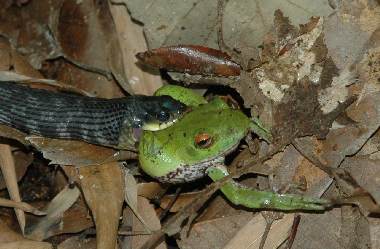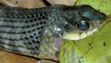 2006年6月24日 大阪府高槻市三好山 ヘビがカエルを飲み込むところを始めてみました。自分の頭よりはるかに大きな蛙です。カエルはモリアオガエル、ヘビはヤマカガシであることを、SSP 画像掲示板を通じて、Cicada-Wさん、RANAさんにそれぞれ教えていただきました。感謝です。ヤマカガシは通常赤や黄色の線がありますが、このような個体もいるそうです。また、目が濁っているので脱皮前のためということもあるそうです。この写真の後、本当にカエルを飲み込んだかどうかは確かめていませんが、しばらく経った後見ると、胴が少しふくれているように思えました(下写真) トップページへ |
