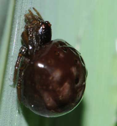2016年8月7日 静岡市駿河区大谷 突起の多い腹部を持つゴミグモです。その名の通り、食べかす、脱皮殻、ゴミなどを集めてその陰に潜んでいます。 トップページへ |