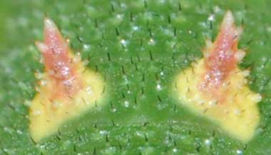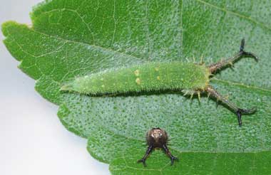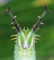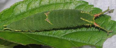(参考) 脱皮して間もない幼虫(5齢、23mm(突起含む)) 2010年4月8日撮影 静岡市駿河区 飼育 2009年12月27日採幼 東京西部山地 by O氏 脱皮して間もない終齢幼虫です。脱いだ皮を食べた後と思われます。ゴマダラチョウの時にも思いましたが、新芽時のエノキに見事に擬態しています。併せて4齢の頭部殻も示します。かわいい顔をしてますね。 トップページへ |