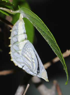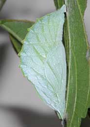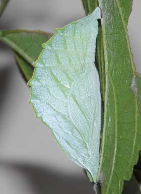 2018年9月9日 静岡市駿河区大谷 観察し続けていたエノキ小木で、ここにはまさかいないだろうとおもってめくった葉裏に大きな蛹がいました。 トップページへ |