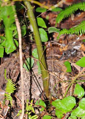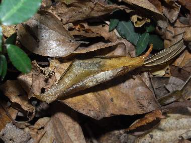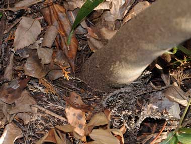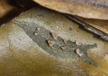 2016年12月10日 静岡市駿河区大谷 個体Aの様子です。11月27日に見たときは葉上にいたものです。エノキの葉はすっかり落ち、この幼虫がいた葉だけは、幼虫の吐いた糸のおかげでかろうじて落ちずにいます。当然この葉には幼虫はいません。まず根元の枯葉を探したのですが、ゴマダラチョウも含め幼虫は見つかりませんでした。そこで、株もとにあった杉の枯葉をよけると、幹にいる幼虫が見つかりました。この1匹だけでした。上に示した、個体B、Cは全く同じところにいました。 トップページへ |