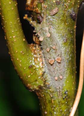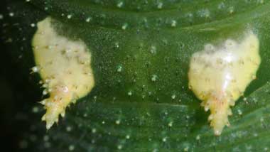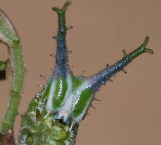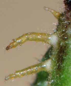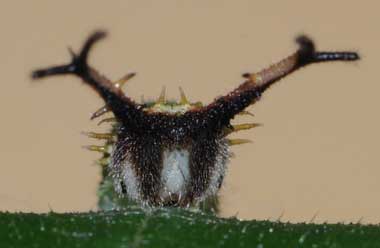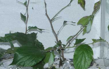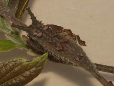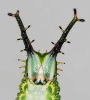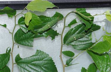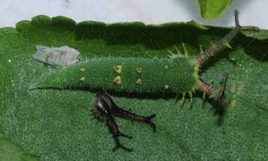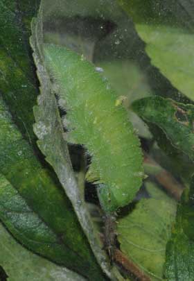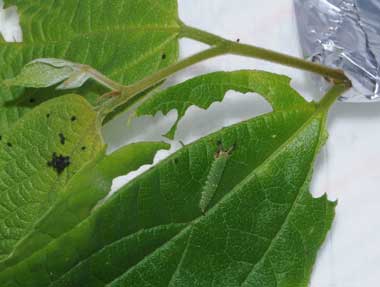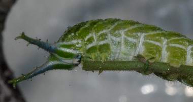 2016年9月10日 撮影 静岡市駿河区 飼育 静岡市駿河区大谷 採卵 個体2。別の新しい枝を入れていたのですが、その葉が邪魔して頭部突起をうまく伸ばせませんでした。 トップページへ |