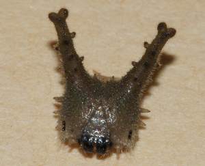 2016年9月11日 撮影 静岡市駿河区 飼育 静岡市駿河区大谷 採卵 個体3。個体2の突起が曲がってしまったので、これからは個体3の様子を載せていきます。こちらは4齢には1日早く脱皮しました。4対の背中の突起が目立っています。尾部の突起は閉じています。頭部突起も長く感じますが、そのほかの突起も目立ちます。 トップページへ |