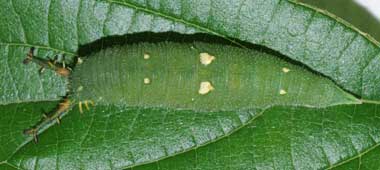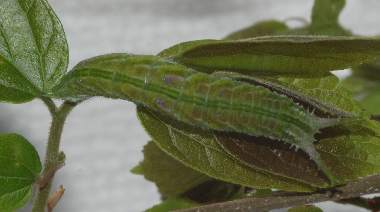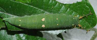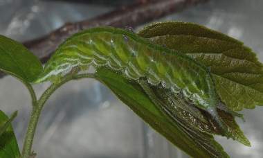 2016年9月2日夜撮影 静岡市駿河区 飼育 静岡市駿河区大谷 採卵 個体2。柔らかい葉はあまり気に入らないのか、少し食べては別の葉に移動しています。それでも順調に成長しています。普段は葉の先に、葉基に向かって、頭部を葉側に向けて静止しています。この葉では中央部を食べていますが、個体3でも、大抵縁部から食べることがほとんどです。少し離れてい見ると、葉の色や糞に紛れてどこにいるのかわかりません。 トップページへ |