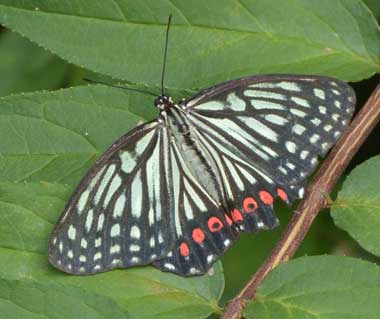 2016年8月31日 静岡市駿河区大谷 下に示す8月28日に観察した後、再度探しに行ったところ、その少し上流で撮影できました。エノキがあると産卵し、それ以外の木の場合には、触れるだけか、この写真のように短時間だけ休むことを繰り返していました。今回も、河川の法面に生えた小さなエノキに産卵していました。翅が少し欠けていますが、比較的新鮮で、欠けの位置が異なるので8月28日に撮影したものとは違う個です。放蝶から広がっていますが、赤星が輝いて大変美しく見えます。蝶には罪はなく、名蝶であることは間違いないと思います。いまだに♂は見ていません。 トップページへ |
