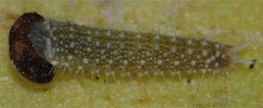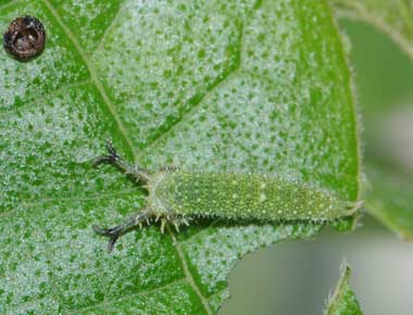 脱皮後成長したアカボシゴマダラの幼虫(2齢、8.9mm)