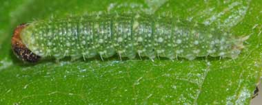 脱皮後間もないアカボシゴマダラの幼虫(4齢、18.8mm)