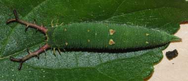 (参考) 幼虫(4齢、20mm) 2010年4月3日撮影 静岡市駿河区 飼育 2009年12月27日採幼 東京西部山地 by O氏 冷蔵庫から出してもしばらく動かなかったので、観察も怠っていたら、いつの間にか芽の枯れたエノキに登っていたので、急いで新しい枝を採ってきて入れたところです。色も少し緑がかっています。 トップページへ |
