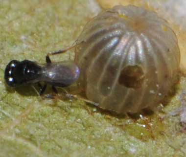 タマゴヤドリバチの仲間に寄生されたアカボシゴマダラの卵の変化と羽化したハチ