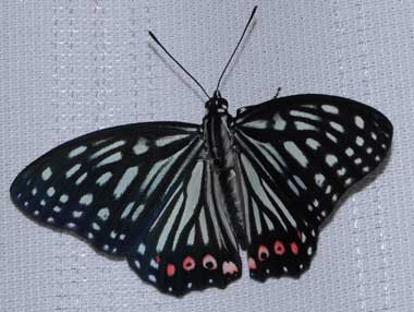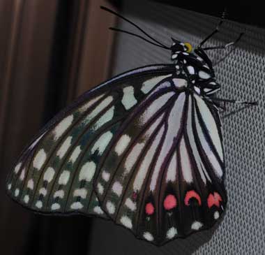 (参考) 羽化後間もないアカボシゴマダラ(♂、春型) 2010年4月27日朝撮影 静岡市駿河区 飼育 2009年12月27日採幼 東京西部山地 by O氏 春型の赤紋は薄いです。これは♂でした。翅全体の感じは♀ではずっと白っぽくなります。蛍光灯スタンドで照らすと、体を温めるためか、翅を全開しました。 トップページへ |