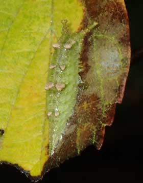 2016年9月6日 撮影 静岡市駿河区 飼育 静岡市駿河区大谷 採卵 個体2。さらに成長すると背中の突起も明瞭になりました。ゴマダラチョウより黄色が強くて目立つ感じです。中央の大きな突起から2つ上の節にある突起も比較的目立つのが本種、あまり目立たないのがゴマダラチョウです。また、尾部の突起では、2本がくっついているのが本種、離れているのがゴマダラチョウです。3枚目の写真では幼虫がどこにいるのかほとんどわかりません。左上の葉の先端近くにいます。 トップページへ |