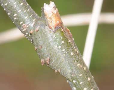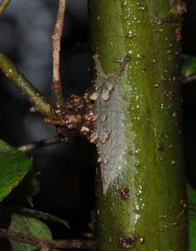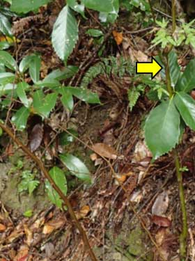 2016年8月31日 静岡市駿河区大谷 この小木で、卵を2個見つけました。アップで載せているのは4の方です。さらに、なぜか根際の幹にも産んでいました(卵は見つけていません)。比較的薄暗い環境です。夏場だから暑い日差しを避けて陰の木を選んでいるのかもしれません。 トップページへ |