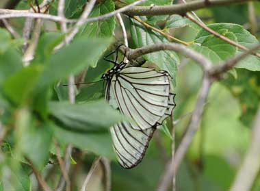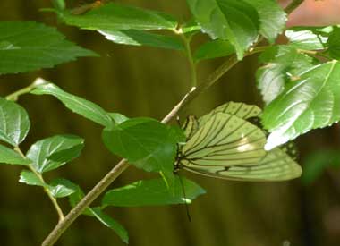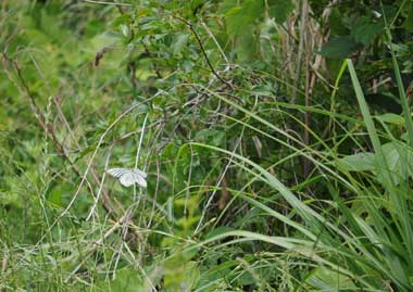 2017年5月27日 静岡市駿河区大谷 下に示す、2016年の夏に産卵を見た場所の近くです。期待通り、白い春型♀が産卵していたようです。少し遠かったので卵は確認できていません。最初スジグロシロチョウかと思うぐらい白く見えます。赤い星もありません。この日は♂を見ることができませんでした。川岸に生えた1mぐらいのエノキの細い樹幹を歩いて、時折静止していたので、産卵したのだと思います。その後ゆっくりと近くを飛んで、エノキ以外の葉にとまり、翅を開いて静止していました。 トップページへ |