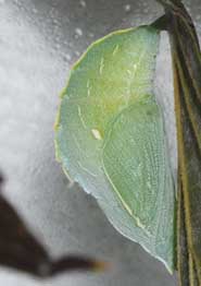 (参考) 前蛹? 2010年4月14日夜撮影 静岡市駿河区 飼育 2009年12月27日採幼 東京西部山地 by O氏 この翌日に会社から帰ると蛹化していました。翌朝もこういう形態だったと思います。いわゆるぶら下がった状態は見損ねました。ですので、ほぼ前蛹状態といえるでしょう。 トップページへ |