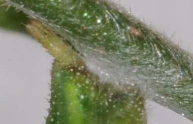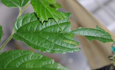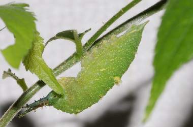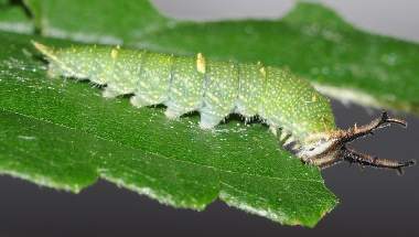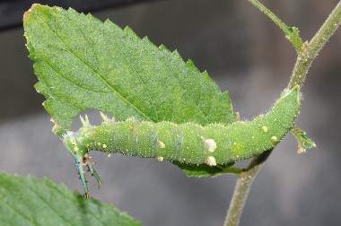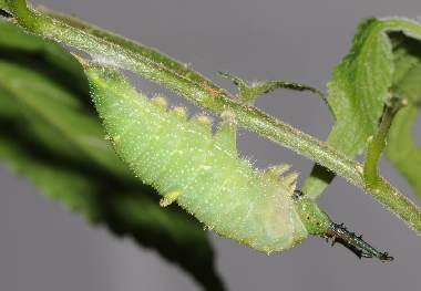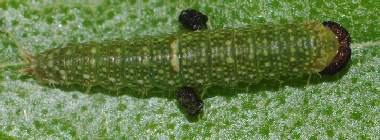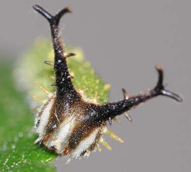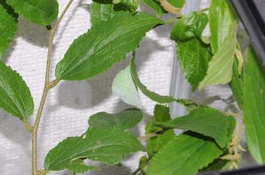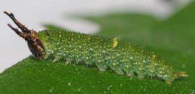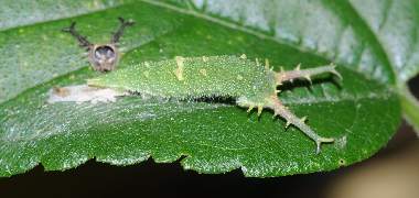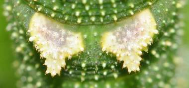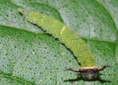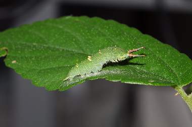 (参考) 成長した幼虫(2齢、8.7mm、クワノハエノキ) 2011年8月27日撮影 静岡市駿河区 飼育 鹿児島県奄美市笠利町 母蝶採集 個体2:こちらは、2齢になってからは本来の食樹であるクワノハエノキで飼育しています。顔は、ゴマダラチョウに比べてかなり黒いです。普段は完全に伏せていて全く見えません。葉を曲げて顔を撮ってみました。クワノハエノキは普通のエノキに比べると葉が細長いです。背中の突起は中央のもののみが色が薄く目立ちます。 トップページへ |