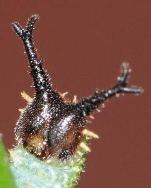 (参考) 摂食中の幼虫(5齢、40mm、クワノハエノキ) 2011年9月10日撮影 静岡市駿河区 飼育 鹿児島県奄美市笠利町 母蝶採集 個体2:葉をよく食べかなり成長しました。頭部の模様も4齢から少し変化しています。背中には大中小の対になった突起があります。中央部の突起が特に大きく、拡大して見ると複雑な構造をしているのが分かります。 トップページへ |