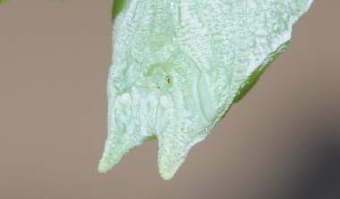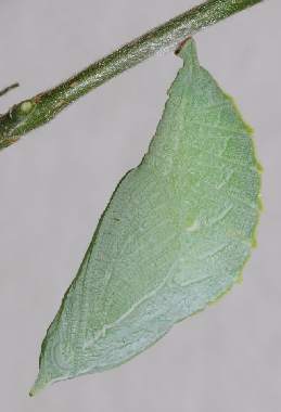(参考) 前蛹(クワノハエノキ) 2011年9月12、13日撮影 静岡市駿河区 飼育 鹿児島県奄美市笠利町 母蝶採集 個体2:大きめの葉がなかったためか、枝で前蛹になりました。最初は腹脚全部で固定されていますが、まず中程の腹脚をはずし、次に尾脚以外をはずして、最後は尾脚と尾端だけでぶらさがりました。 トップページへ |