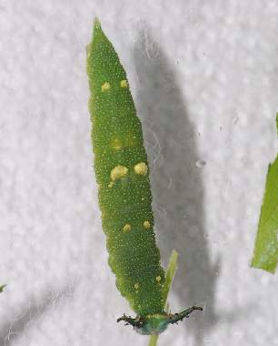 (参考) 幼虫(5齢、29.5mm、エノキ) 2011年9月10日撮影 静岡市駿河区 飼育 鹿児島県奄美市笠利町 母蝶採集 個体1:静岡市の道路脇に生えているエノキ切り枝での飼育です。ここまで何の問題もなく成長し終齢になりました。 トップページへ |