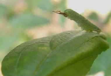 ゴマダラチョウの幼虫(12mm、3齢) 2003年8月23日 大阪市淀川区産・飼育 時々このような威嚇姿勢を示します。どれだけ効果があるのでしょうか。 トップページへ |