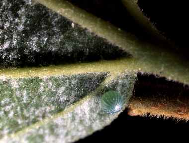 ゴマダラチョウの卵 2003年8月3日 大阪市淀川区 ゴマダラチョウが産卵に来てくれたらいいな、と思いながら植えていたエノキを何気なく見たら、突然、ゴマダラチョウがとまりました。13:50頃でした。夏の暑い日でした。カメラを部屋にとりに戻っている間に飛んでいってしまいましたが、かすかな期待を持って止まっていたあたりを探すと、期待通り、卵が見つかりました。葉裏の基部近くです。 トップページへ |