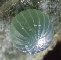 ゴマダラチョウの卵(孵化前兆) 2003年8月6日 大阪市淀川区 孵化を二日後に控えて、頭部の黒と体の緑が分かるようになりました。 トップページへ |
