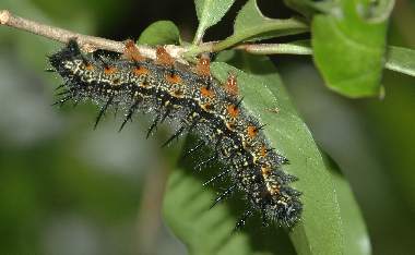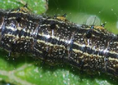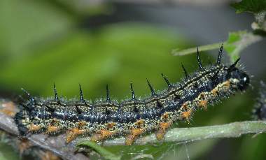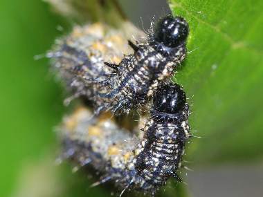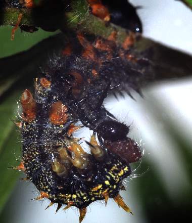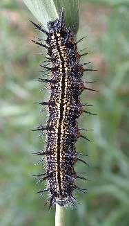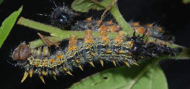 2007年5月5日 兵庫県伊丹市車塚笹原公園 産 大阪市淀川区飼育 4齢になりました。終齢になる直前です。3日程度毎に脱皮します。ただしそれは室内で飼育しているからで、自然天候下では大部遅れます。4齢でも毛虫というより棘虫で、太い突起に毛が生えた感じです。いわゆる真性タテハ類(アカタテハやルリタテハなど)の幼虫の特徴です。 トップページへ |