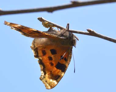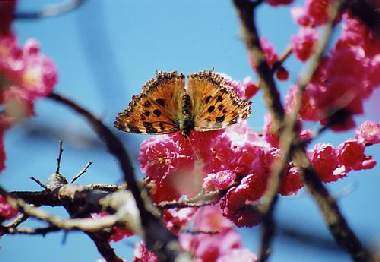 2013年3月23日 静岡市駿河区大谷 下方に示す産卵と求愛を観察した同じ時間に、他の越冬明けのヒオドシチョウがキブシで吸蜜していました。 トップページへ |