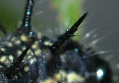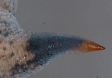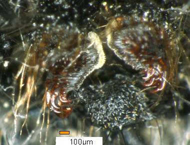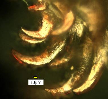 (参考) 脱皮殻尾脚のかぎ爪 2006年5月28日 大阪府豊能町産 大阪市淀川区飼育 前蛹がどのような仕組みでぶら下がっているのか、脱皮した皮を顕微鏡で調べてみました。蛹はぶら下がった後、2度とはずす必要はないのですが、脱皮の皮の場合には後ではずす必要があります。その仕組みを知りたかったのです。この写真で分かるように、鎌のような円弧の爪のため、うまく動かせばするっと抜けることが分かりました。蛹が尾端を皮から抜いてかぎ爪で糸座にしっかりと食い込もうとするときには、既にこの皮は脱げていますから、おそらくバネのような力でうまく動いてほとんど抜け、最後に蛹が尾端を振って完全に抜くのではないかと推測します。 トップページへ |