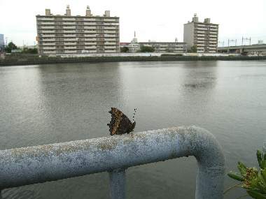 | ヒオドシチョウは郊外山地では珍しくありませんが、大阪市内ではなかなか見られない珍しい蝶です。しかし、2002年には、その非常に美しい個体をマンションの敷地で見つけました。最初に見つけたのは私ではありません。マンションの子供たちが、「見たこともないきれいな蝶がいる」と教えてくれたのです。最初裏側しか見せてくれてなかったので、きっとルリタテハだと思いました。しかし、それはこの写真でお見せするとおり、羽化直後のヒオドシチョウでした。エノキを始め多くの木の葉を食べるようなので、大阪市内でもきっとどこかで発生していると期待してます(その後、淀川区の神崎川沿いのエノキで幼虫の集団を見つけました)。服部緑地公園にも成虫の目撃情報があります。西宮市甲山周辺では2005年に幼虫が多数観察されました。さらに、兵庫県伊丹市の都市部の笹原公園で、2007年4月に、伊丹市の五十川(いそがわ)氏によって2幼虫集団および孵化後の卵塊が発見されました。静岡市南部では、山地で越冬明けの成虫を時々見たり、エノキに幼虫集団を見ることがあります。産卵や卵塊を見つけるのは非常に困難ですが、人工採卵から羽化までの飼育記録も載せました。 |