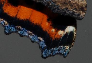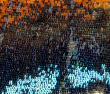 (参考) 後翅の拡大 2006年6月7日 大阪府豊能町産 大阪市淀川区飼育 鮮やかな緋色と水色の鱗粉のある部分の翅を拡大してみました。 トップページへ |
