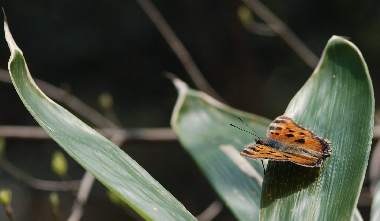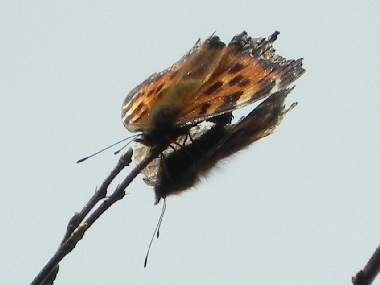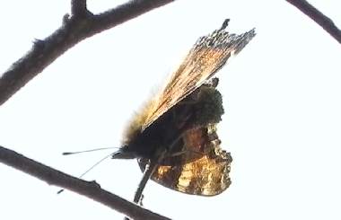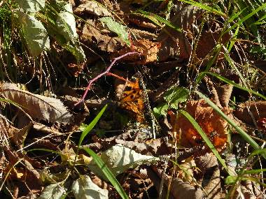 (参考) 日光浴 2010年11月3日 撮影 静岡市葵区県民の森(標高1500m) 快晴無風の気持ちのよい日でしたが夜は0℃ぐらいに冷える時候です。散策中ときおりタテハが颯爽と飛ぶのが観察できましたが、やっと撮影でき、ヒオドシチョウであることが確認できました。ヒオドシチョウは、6月に羽化した後は、標高の高いところに上がり夏眠、冬眠して春先にまた降りて産卵すると言われていますが、夏眠、冬眠の場所があまり観察されていません。おそらくこの地近くにそういう場所があるものと思います。暖かい日には活動することが分かりました。 トップページへ |