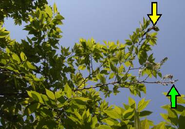 2007年4月29日 兵庫県伊丹市車塚笹原公園 2006年からボランティアの方々によって整備されているバタフライガーデンのエノキに、幼虫集団が発見されました。発見者はボランティアの一人である五十川さんです。同様にボランティアの山本さんから連絡を受け、観察してきました。黄色矢印が幼虫集団、緑矢印が孵化後の卵塊のあるところです。エノキの樹高は3mぐらいで、巣があるのは2mぐらいです。都市部で成虫を見る機会はほとんどありませんし、ましてや越冬後の成虫はこれまでありません。しかし越冬後の成虫が産卵したことは間違いありません。 トップページへ |