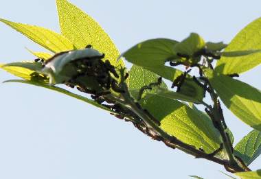 2010年4月27日朝撮影 静岡市駿河区 飼育 静岡市駿河区大谷 採取 卵塊に近い枝先で孵化したばかりの幼虫が集団を作っています。卵塊にはもうすぐ孵化しそうな卵が少し残っています。 トップページへ |