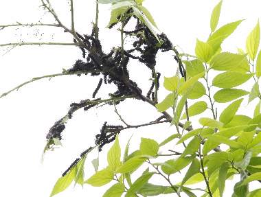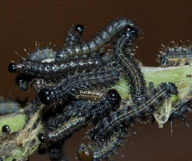 2015年4月18日 静岡市駿河区大谷 3月28日に産卵を見た卵から孵化した幼虫が糸で作った巣の内外で集団で暮らしている様子です。 トップページへ |