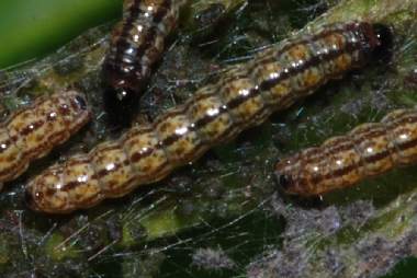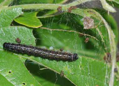 幼虫(3齢、8mm、エノキ)、巣網(おそらく若齢時のもの)
