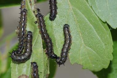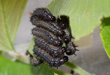 2008年5月2日 大阪市淀川区十八条 これまでに新鮮なヒオドシチョウを2回見ているので、淀川区内で発生しているのは間違いないと思っていましたが、やっと集団幼虫を見つけることができました。しかしこの幼虫は結局鳥にやられて全滅したようです。5月6日に見たときには何かに食われた終齢幼虫の死骸が1匹あっただけでした。 トップページへ |