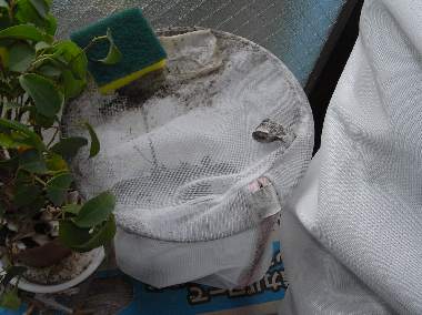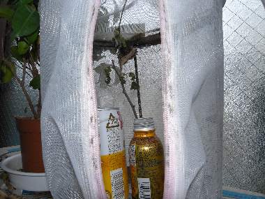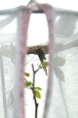 2010年4月10日 撮影 静岡市駿河区 飼育 2010年4月10日 採取 静岡市駿河区大谷 ヒオドシチョウは、越冬後にエノキの枝先に、卵塊を作って産卵することが知られています。卵塊を作ると言うことは、産卵回数が少なく、その観察はかなり難しいと思われます。私もこれまでチャンスに恵まれません。そこで、母蝶を採取して、強制採卵を試みました。100均の洗濯袋と100均の鉢枠を組み合わせた、産卵場所を作り、この中に、ビール缶の吸水台とエノキの枝を入れます。また、洗濯袋の上には吸水紙(ティッシュ)にポカリスエットの薄めたものを染みこませておきました。 トップページへ |