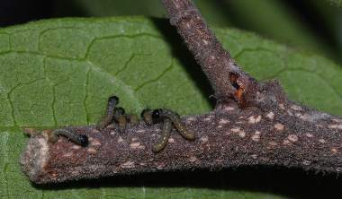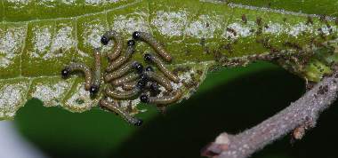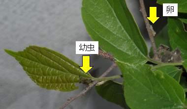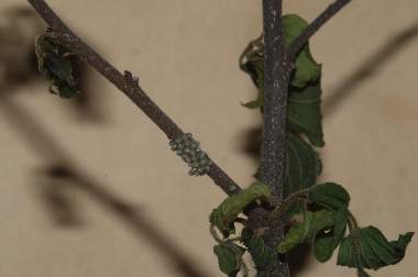 ヒオドシチョウの幼虫群と卵塊(エノキ)