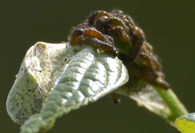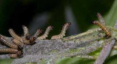2007年4月29日 兵庫県伊丹市車塚笹原公園 幼虫集団は2つみつかり、これは上に示した写真とは別のものです。脱皮直前の2齢(?)、脱皮直後で頭がオレンジ色のもの、黒くなったものが混じっています。 トップページへ |