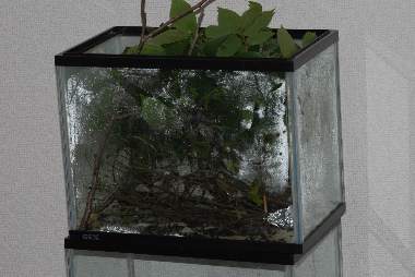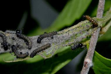 2007年4月30日 兵庫県伊丹市車塚笹原公園 産 大阪市淀川区飼育 集団の一部を飼育箱中で飼育しています。ビニール袋を切り開いたもので蓋をし、ほぼ湿度100%にしています。葉はしおれることはなく、糞にはカビが生えますが、問題ありません。 トップページへ |