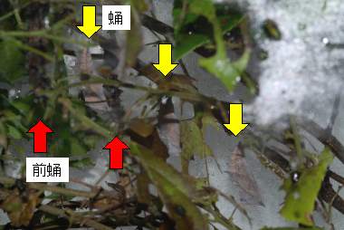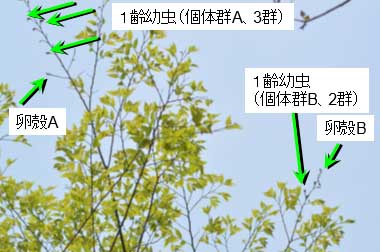 ![]() ↑左右に2集団 ![]() ↑個体群Aの幼虫群 ![]() ↑個体群Bの2つの幼虫群 ![]() ↑個体群Bの卵塊 |