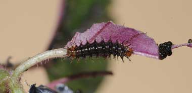 (参考) 脱皮後成長したイワサキタテハモドキの幼虫(3齢、7.4mm、シソモドキ) 2017年7月30日 撮影 静岡市駿河区 飼育 沖縄県石垣島産母蝶採卵 個体2:脱皮1日後なのですが、もう眠に入ってしまいました。気温は32℃を超えているので、熱帯性のこの蝶にとってはちょうどいいのかもしれません。 トップページへ |