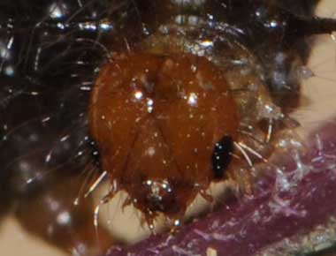 (参考) 脱皮後成長したイワサキタテハモドキの幼虫と食痕(6齢、35.0mm、シソモドキ) 2017年8月9日 撮影 静岡市駿河区 飼育 沖縄県石垣島産母蝶採卵 個体2:6齢になりました。これが終齢のようです。ほぼ真っ黒ですが、側面に濁ったオレンジ色のすじがあります。なお、個体2と他の個体1匹を一緒に入れていたので、どちらかは分かりません。 トップページへ |